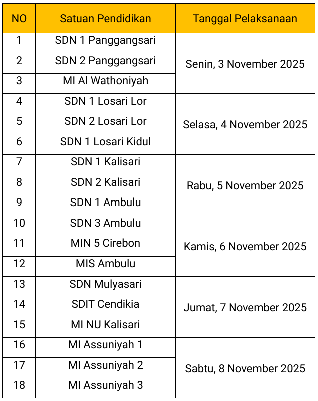 Jadwal Imunisasi Tingkat SD/MI Wilayah Kerja Puskesmas LosariOleh admin / November 15, 2025 Berikut merupakan Jadwal Imunisasi Tingkat SD/MI di wilayah kerja Puskesmas Losari :